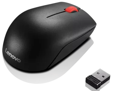 עכבר אלחוטי Lenovo ThinkPad עם חיבור USB נייד, עיצוב ארגונומי וגלגלת אדומה מסורתית של ThinkPad.